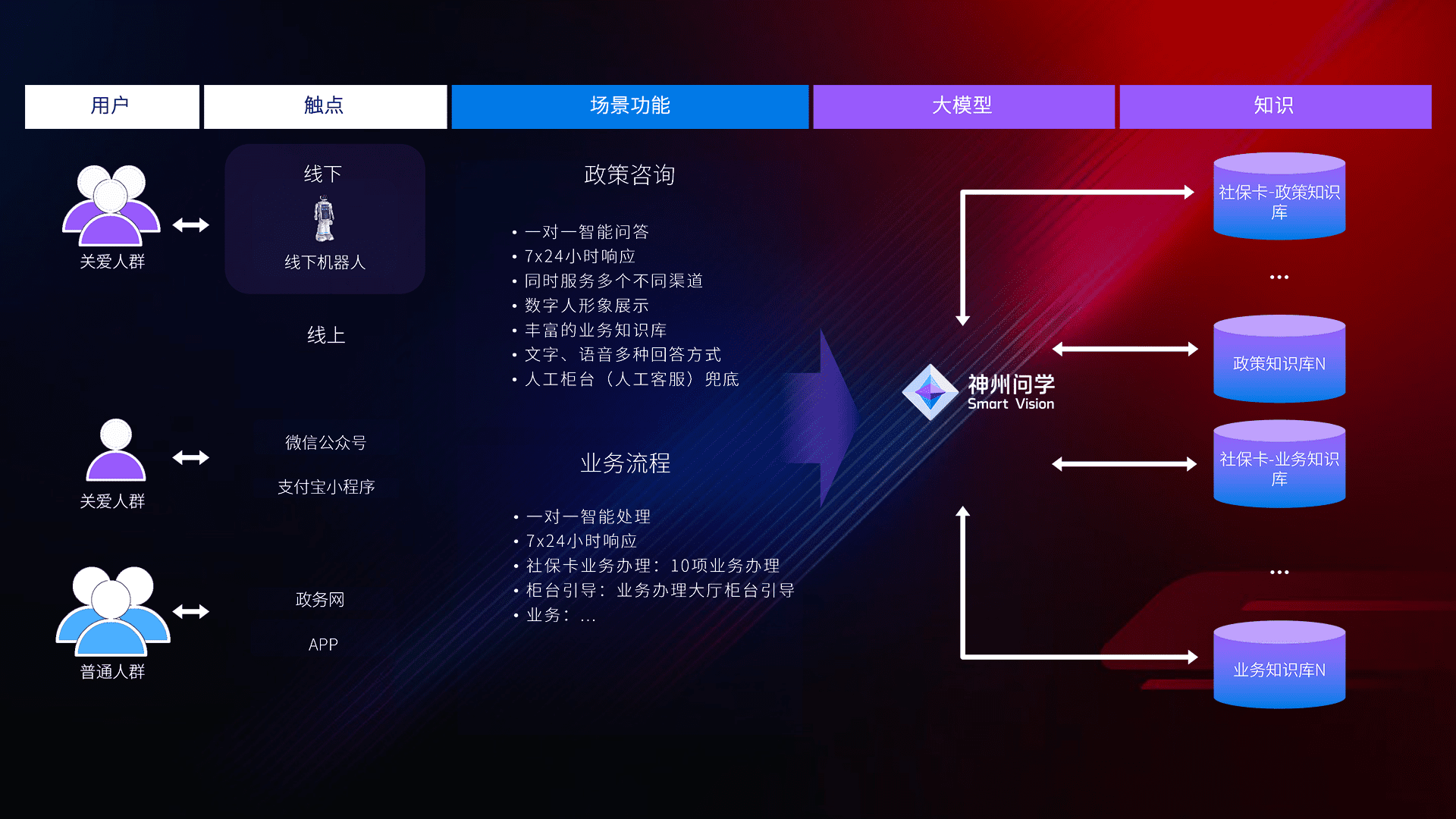 • 线上线下全覆盖:线上提供微信公众号、、、、支付宝小程序、、、、政务网、、、app多种渠道,,,,与线下机器人形成完整服务体系。。。。