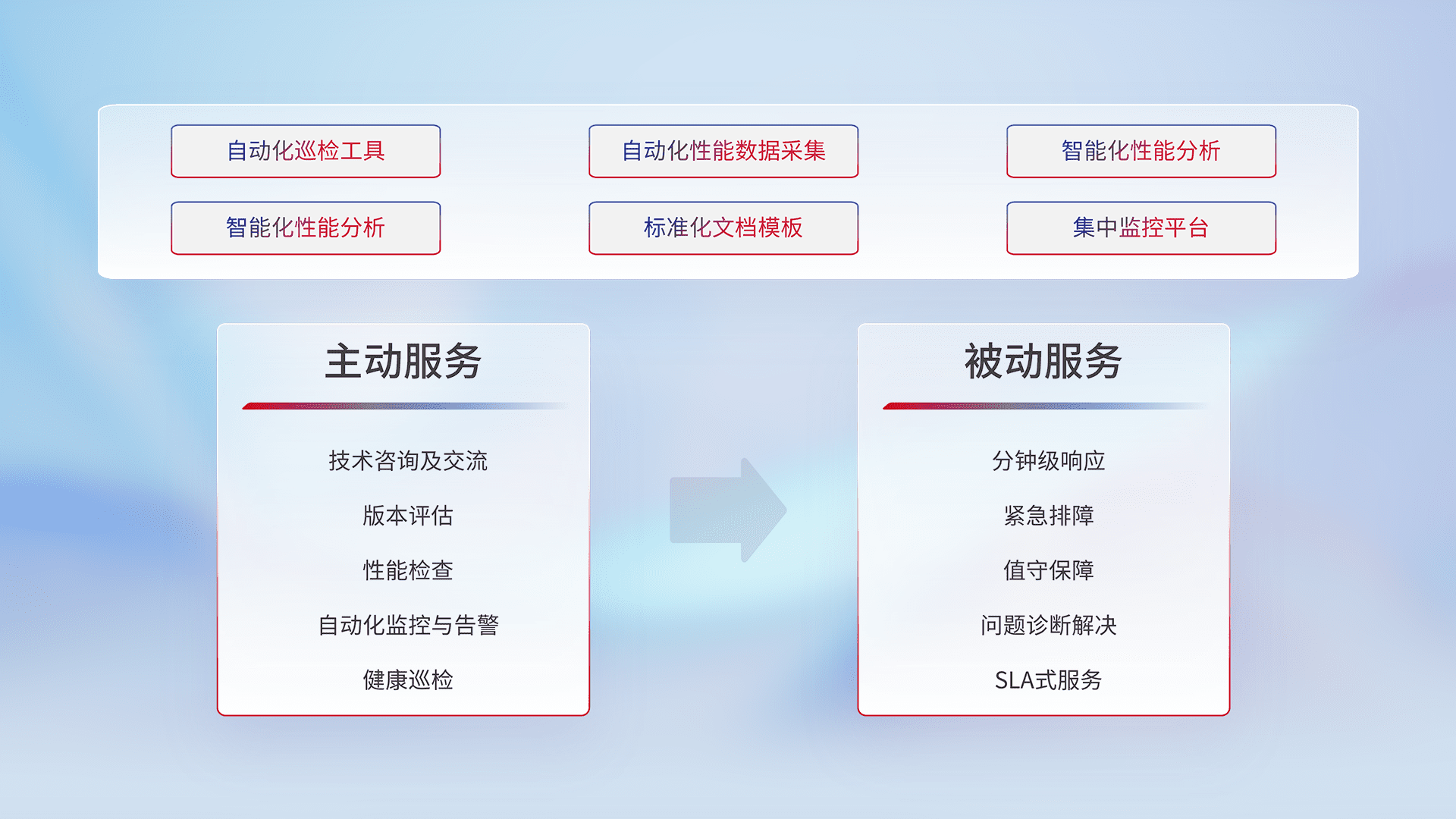 智能化工具和标准化文档,,保障服务质量,,,提供主动服务(包含技术咨询、、版本评估、、、性能检查、、、自动化监控与告警、、健康巡检)和被动服务包含(分钟级响应、、、、紧急排障、、值守保障、、、问题诊断解决、、SLA服务)。。